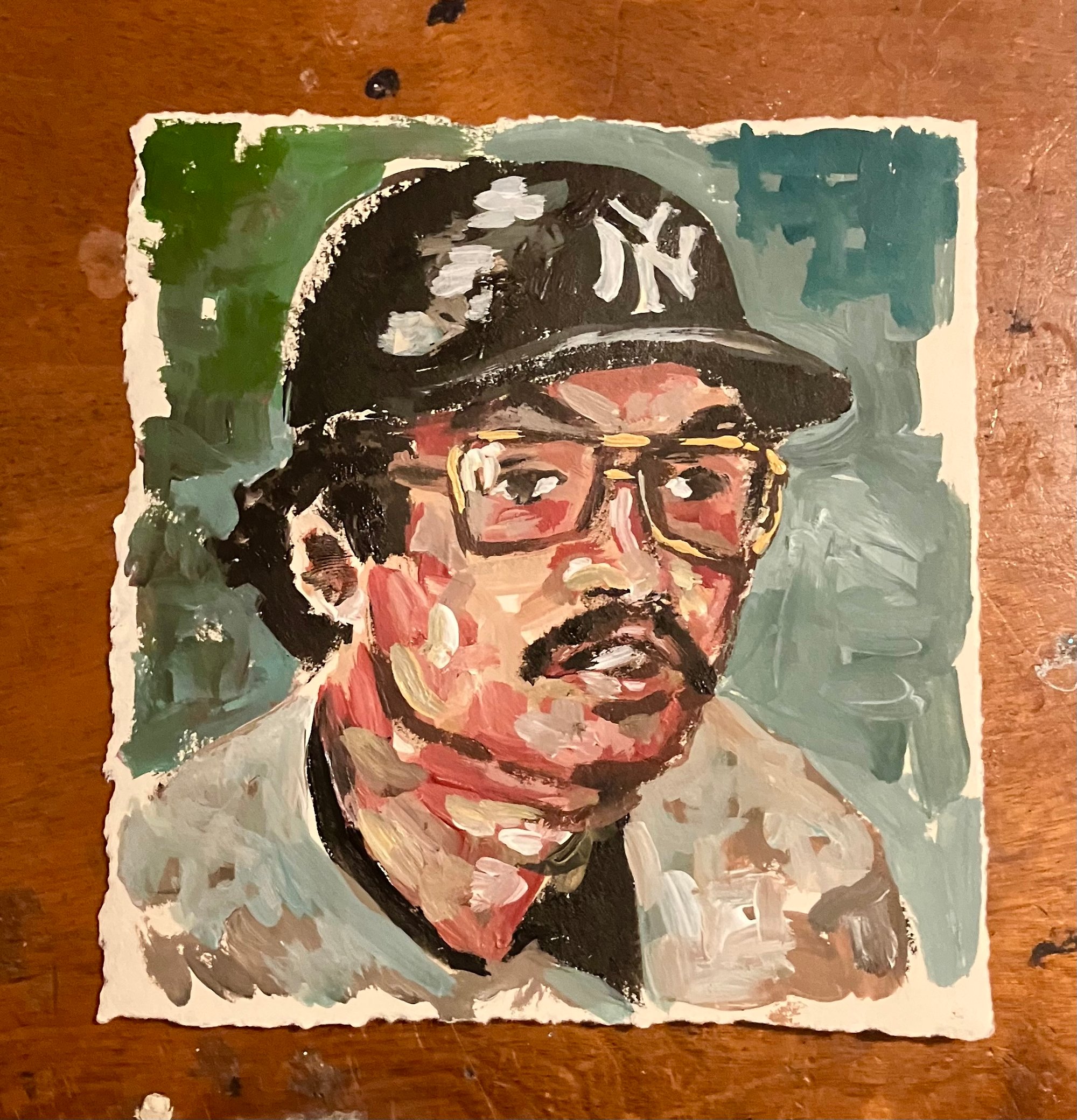 Five and a half by six inch acrylic painting on heavy printmaking paper of Reggie Jackson.