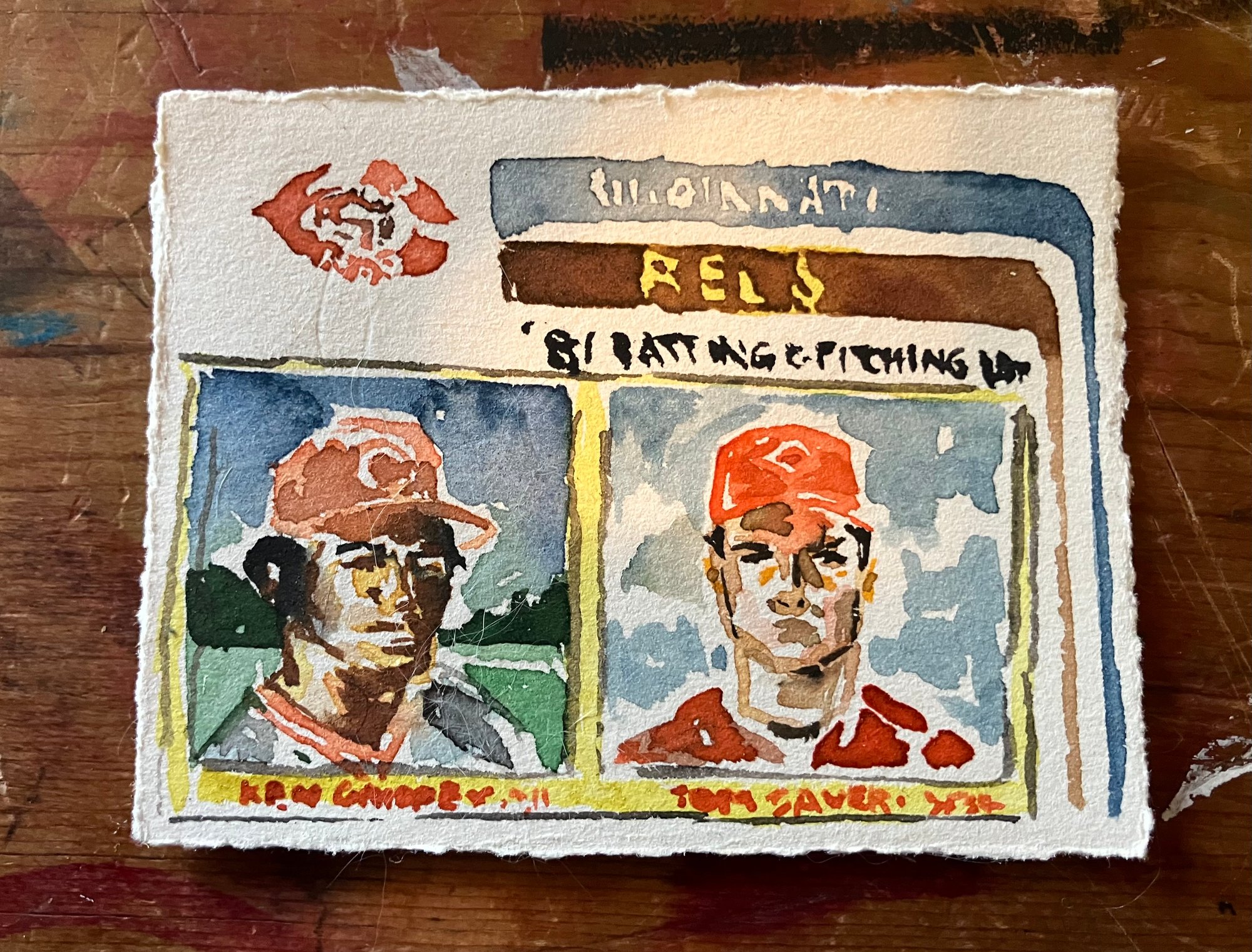 Two and a half by three and a half inch watercolor painting of a Cincinnati Reds team leaders card featuring Ken Griffey and Tom Seaver.