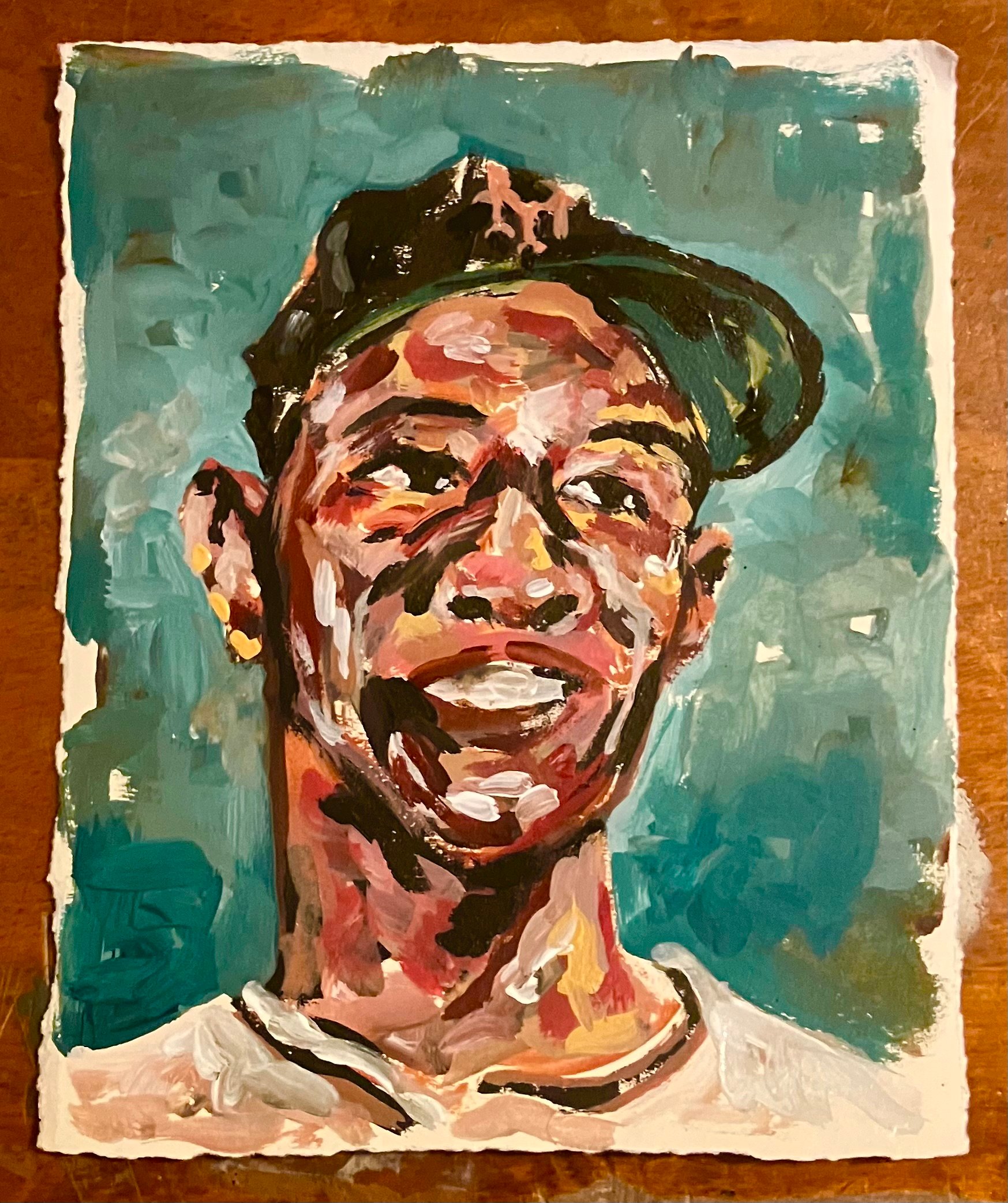 Six and a half by 7 and half inch acrylic painting of Willie Mays on heavy Stonehenge printmaking paper.